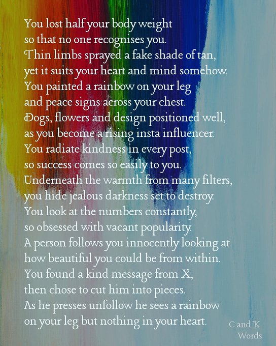 My friend showed me the image and gave me the words, “A rainbow on your leg but nothing in your heart”, so I could write a poem.